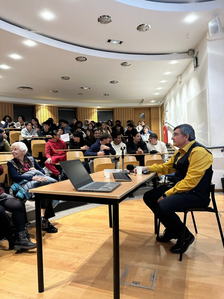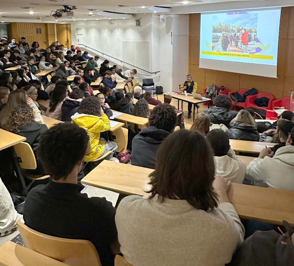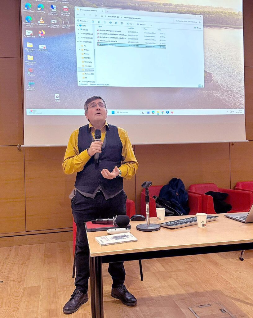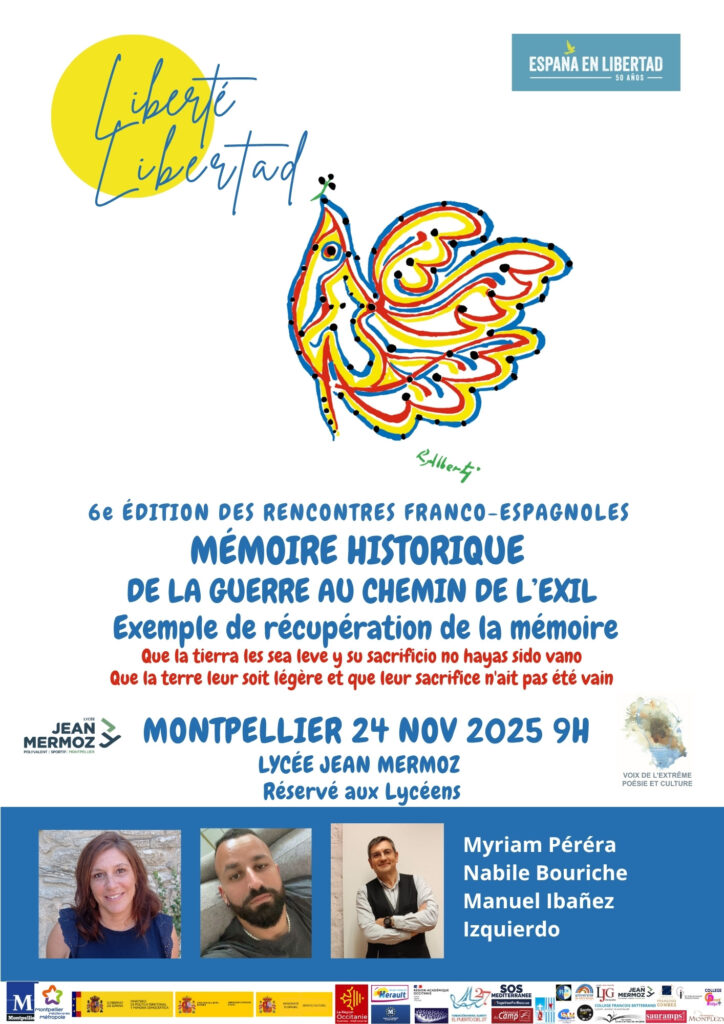 Entre el 19 y el 25 de noviembre la asociación Voix l’ extréme poésie et culture, de la localidad francesa de Montpellier, ha celebrado en esa ciudad los VI Encuentros Franco-Españoles que este año se han centrado en los 50 años de la muerte del dictador Franco. Las actividades programadas han estado enfocadas a la transmisión de la memoria y, en especial, al papel de la educación, los educadores y los alumnos. Y en ese marco la Asociación para la Recuperación de la Memoria Histórica de Alcalá de Henares, en la figura de su presidente, Manuel Ibáñez, ha impartido una ponencia a centenar y medio de alumnos de educación secundaria del Liceo Jean Mermoz.